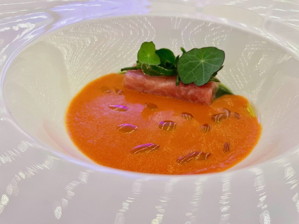 En esta cena los asistentes pudieron disfrutar de uno de los platos que componía el menú elaborado con Atún Rojo Balfegó por el chef David Olivas del restaurante Back*, sería `Atún Rojo Balfegó, jugo frío de pimientos y hojas verdes´.