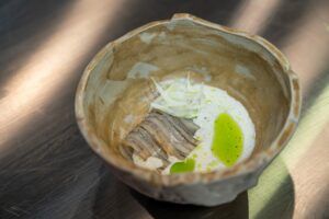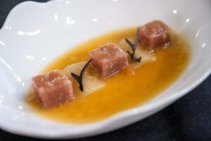 They transported us to their kitchen in Seville with a stunning ‘Pellejito’ with fennel and salsa verde, where the duo masterfully used Balfegó bluefin tuna belly and skin to craft their dish.