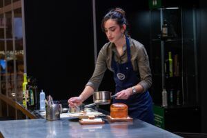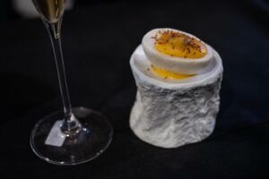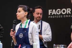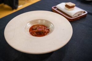 The duo of chefs from Galicia prepared their ‘Re-Ovolución‘ live, recreating the classic stuffed tuna eggs they both remembered from their mothers’ and grandmothers’ kitchens at home. However, they made a cutting-edge and highly personal version, where rib, heart, and cheek were the selected pieces to create their dish.