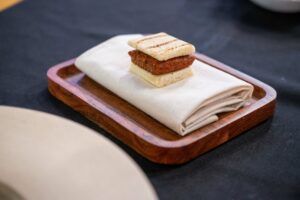 Lucía presented the chorizo sando as a small bite served off the plate. She crafted it using tuna belly, which she had previously transformed into seafood chorizo, before utilizing its interior.